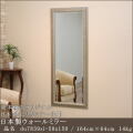 渋いアンティークシルバーの岡本鏡店オリジナルウォールミラーです。「いいものをお手頃価格で」をモットーにしていますのでいわゆる「激安」ではありませんが長年使える高い品質です。フレームは木製で一点ずつ丁寧に組み上げたハンドメイド。ミラーは日本製5ミリ厚ブランドミラーを使用し幅の広い面取り加工で仕上げていますので映りはもちろん見た目も高級感があります。使用しているミラーの大きさは150センチ×50センチで縦長に使うと全身が完全に映せます。またいつも反対側を映しているだけなので空間に広々感と明るさを与える効果があります。取り付けてしまうのもいいですが、立掛けて使うのもおすすめです。お部屋を気軽でくつろいだ雰囲気にしてくれますし十分に全身も映せますので実用面も合わせて一石二鳥の効果です。立掛けて使う場合は壁から15センチ程度離すと安定して立てられます。またフレームの左右に均等に力がかかる様にするとミラーにゆがみが生じません。40センチ程度離れれば全身が映るはずです。色調は渋みのあるアンティークシルバー。パターンも変化に富み飽きの来ないデザインです。厚みは約3センチですがごつごつした感じはしないと思いますし、むしろフレーム幅とのバランスはいいと思います。色調は渋みのあるアンティークシルバー。パターンも変化に富み飽きの来ないデザインです。厚みは約3センチですがごつごつした感じはしないと思いますし、むしろフレーム幅とのバランスはいいと思います。フレーム裏側に「とっこ式固定金具」というミラーを完全に固定できる金具を設置した上お届けします。通常は縦長使い用に設置しますので横長使いご希望の際はご注文時にその旨お伝え下さい。