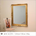 こういうウォールミラーの場合、安いものだとポリスチレンなどの樹脂製が多いのですが、このウォールミラーは芯材に木を用い装飾部分をMDFで仕上げるという昔から続く方法で仕上げています。木製と樹脂製の違いは色々ありますが、ひとつは耐久性やよじれが少ないなどの品質上の違い。もうひとつは質感の違いといえます。もちろん樹脂製よりも木製の方が品質は高いですし特に質感については雲泥の差があるといえるでしょう。仕上げはアンティークゴールドで真鍮箔を押した後燻しをかけることにより独特のアンティーク感を出しています。ミラーは5ミリ厚を採用し幅広面取り加工を施しているので映り高級感ともに高いレベルにあります。