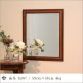 どこか古めかしい雰囲気のするフレームですが、アンティーク調に仕上げているだけで古いものではありません。材質は木で縦長横長どちらにでも使えますし胸元辺りまでなら映ります。チェーンで吊って使える様に縦長使いを前提にお届けしていますので、横長使いや完全に固定してしまいたい場合はご注文時に相談して下さい。ミラーは5ミリ厚幅広面取り仕様ですのでゆがみなくクリアに映ります。壁に吊り下げて使うのもいいですが、チェストの上などに立掛けて使うのも結構便利だと思います。お化粧にはうってつけの大きさです。