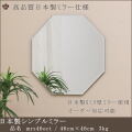 高品質日本製5ミリ厚ミラーを使用したシンプルで高級感あるウォールミラーです。見た目とバランスがいい正八角形で周囲は約1センチ幅の面取り加工を施して仕上げています。浴室内など高温多湿な場所では使えませんが洗面所やトイレでしたら問題なくご使用になれます。とてもシンプルに仕上げていることから、清潔感がありまたお手入れも簡単ですのでこういう場所には最適です。真横から見るとわかる様にミラーと壁の間には1センチ程度の隙間が生まれます。これは鏡の裏に9ミリ厚の合板を貼って仕上げているためでこうすることにより吊り金具が見えなくなるのとミラーが立体的になります。大きさは46センチ×46センチで上半身(胸の辺りまで)映すことができます。鏡側の吊り金具(取付金具)は、予めお付けしていますので壁の材質にふさわしいネジで取り付けて下さい。このシンプルミラーシリーズには他に、まん丸・長方形・オーバルなど形に数種類のバラエティーを取り揃えています。またサイズオーダーも1枚から承れます。お値段など詳しくはサイズ表をご覧下さい。面取り加工とはミラーの周囲を斜めに削り磨きをかけて光らせた仕上げのことで、一般的には2ミリ程度の幅ですが9ミリ面取りにすることにより高級感がより増します。ダイヤのカットと同じでキラキラ感が増すからです。3キロ程度で、1ヶ所で固定する様にしています。とっこ式固定金具はネジによる固定になります。三角吊り金具はXフックが使えます。ご希望時はお知らせ下さい。